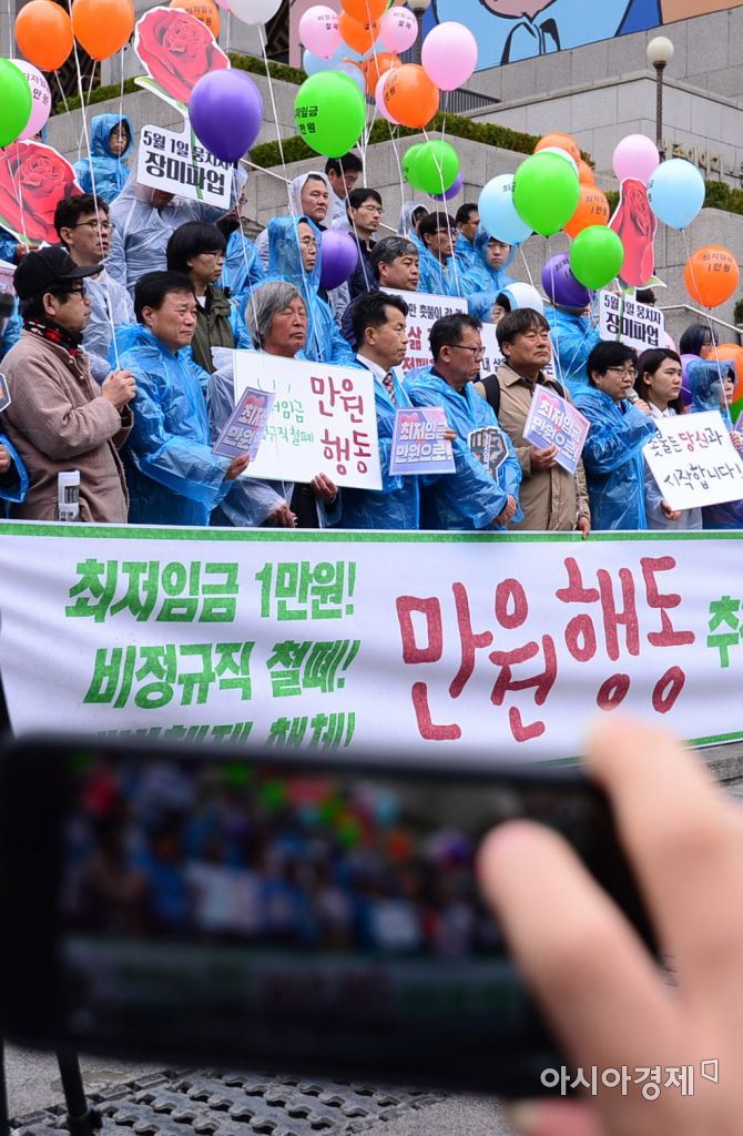 [아시아경제 문호남 수습기자] 5일 서울 종로구 세종문화회관 인근 계단에서 '최저임금 1만원ㆍ비정규직 철폐 '만원행동' 출범 기자회견'이 열리고 있는 가운데 한 시민이 인터넷 방송 중계를 하고 있다.문호남 수습기자 munonam@asiae.co.kr<ⓒ세계를 보는 창 경제를 보는 눈, 아시아경제(www.asiae.co.kr) 무단전재 배포금지>