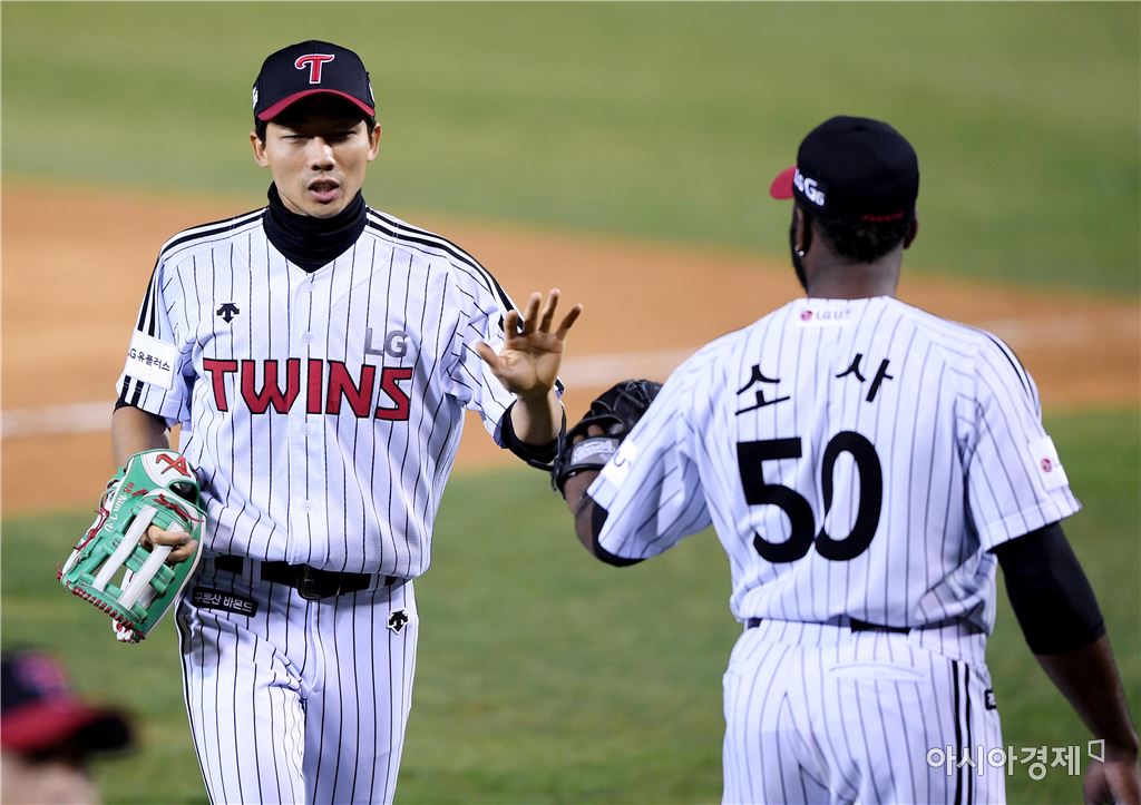 [아시아경제 김현민 기자]프로야구 삼성 라이온즈와 LG 트윈스의 2017 KBO리그 경기가 6일 잠실구장에서 열렸다. 4회말 2사에서 LG 중견수 김용의가 삼성 이승엽의 타구를 잡아낸 뒤 선발 소사와 하이파이브하고 있다. 김현민 기자 kimhyun81@asiae.co.kr<ⓒ세계를 보는 창 경제를 보는 눈, 아시아경제(www.asiae.co.kr) 무단전재 배포금지>