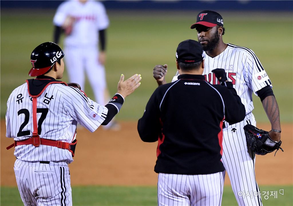 [아시아경제 김현민 기자]프로야구 삼성 라이온즈와 LG 트윈스의 2017 KBO리그 경기가 6일 잠실구장에서 열렸다. LG 선발 소사가 8회초 2사에서 최성훈과 교체돼 마운드를 내려고기 전 유강남 포수와 하이파이브하고 있다. 김현민 기자 kimhyun81@asiae.co.kr<ⓒ세계를 보는 창 경제를 보는 눈, 아시아경제(www.asiae.co.kr) 무단전재 배포금지>