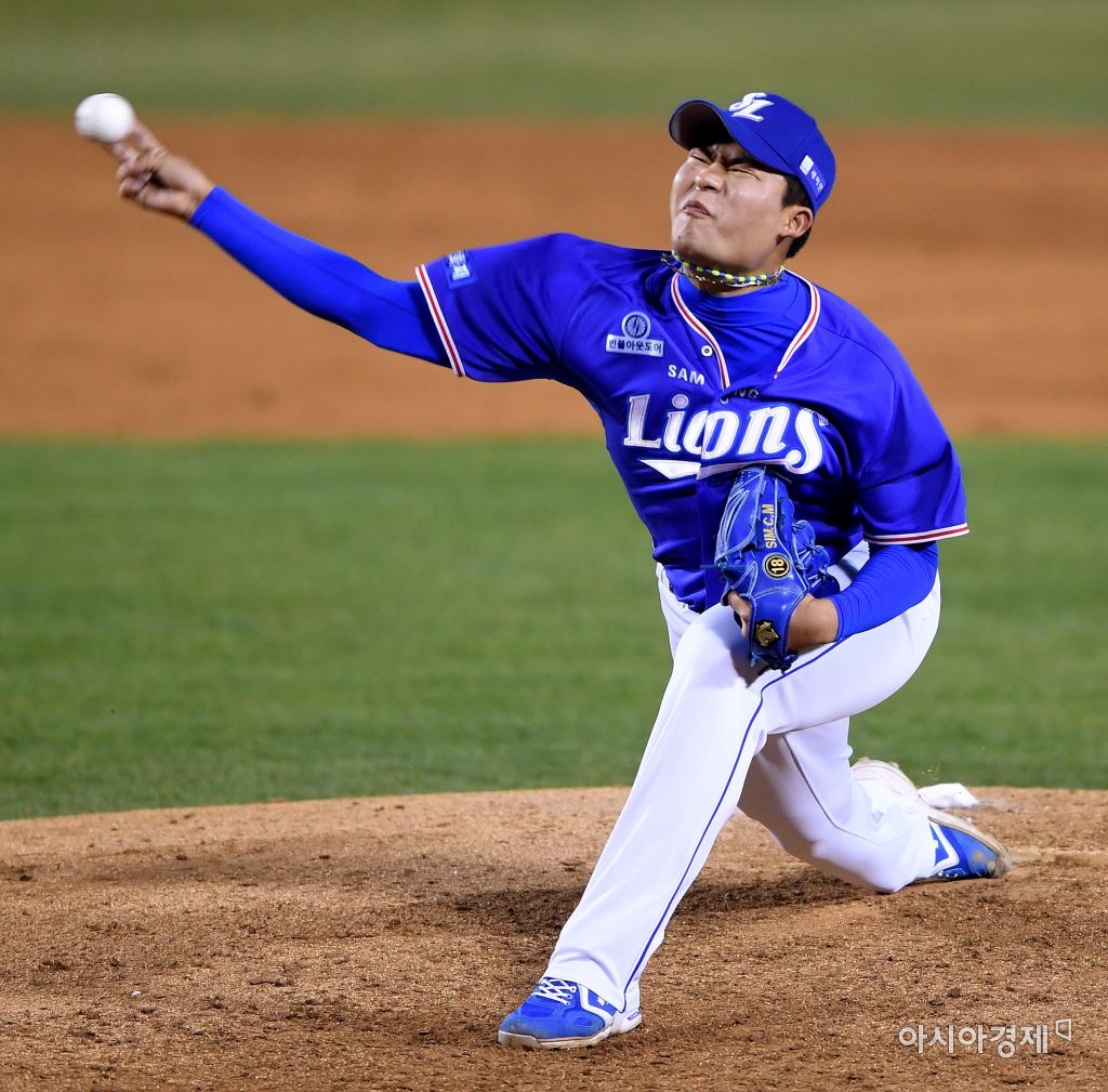 [아시아경제 김현민 기자]프로야구 삼성 라이온즈와 LG 트윈스의 2017 KBO리그 경기가 6일 잠실구장에서 열렸다. 8회말 삼성 구원투수 심창민이 역투하고 있다. 김현민 기자 kimhyun81@asiae.co.kr<ⓒ세계를 보는 창 경제를 보는 눈, 아시아경제(www.asiae.co.kr) 무단전재 배포금지>