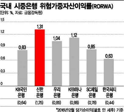 [아시아경제 손선희 기자] 은행권이 '효율화' 시대를 맞았다. 출범과 동시에 반향을 일으킨 인터넷 전문은행 케이(K)뱅크는 몸집 자체는 기존 대형 시중은행에 비해 턱없이 작지만, 점포도 은행원도 없이 '24시간 어디서나' 운영된다는 점에서 비용 절감에 따른 효율성만 놓고 보면 월등하다. 이에 따라 그간 꾸준히 지적돼 왔던 시중은행의 '자산 효율성'이 본격 화두가 될 전망이다.7일 은행권에 따르면 지난해말 기준 국내 6개 시중은행의 위험가중자산이익률(RORWA)은 신한은행이 1.31%(이하 세전 당기순익 기준)로 가장 높았다. 이어 KEB하나은행 1.12%, 우리은행 1.04%로 뒤를 이었다. 국내 은행권 중 직원 및 지점이 가장 많아 '리테일 강자'로 불리는 KB국민은행은 0.83%로 4대 대형 시중은행 중 유일한 소수점대를 기록했다. 외국계 시중은행인 SC제일은행과 한국씨티은행도 각각 0.85%, 0.63%에 그쳤다.RORWA는 대출자산 별 위험가중치를 부과해 산정한 '위험가중자산(RWA)' 대비 순이익 비중을 따진 것으로, 총자산이익률(ROA)에 비해 자산 효율성을 보다 정확히 드러내는 지표로 평가된다.예컨대 주택담보대출 등 우량대출만 취급할 경우 절대 수익 자체는 올라가겠지만 효율성을 따지는 RORWA에는 오히려 부정적 영향을 준다. 흔히 지적되는 '앉아서 돈 버는' 구조다.한 시중은행 재무담당자는 "은행은 우량 대출만 취급하면 얼마든지 돈을 벌 순 있겠지만 효율은 떨어진다"며 "위험가중자산이 많다고 해서 부실하다는 의미는 아니며, 적정한 수준의 국제결제은행 기준 자기자본(BIS) 비율을 유지하는 선에서 위험가중자산으로 수익을 더 절실히 내야 한다"고 지적했다.이 지표는 이미 해외 금융시장에 통용되며 주요 글로벌 은행은 통상 2%대 안팎을 유지하고 있는 것으로 알려졌다. 국내 은행의 자산효율성은 이에 턱없이 부족한 수준이다. 법인세를 제외한 당기순이익으로 산출된 RORWA를 살펴보면, 신한은행(1.25%)를 제외한 5개 은행 모두가 0%대에 그쳤다.특히 업계 유력 경쟁상대로 지목되는 KB국민은행은 0.64%에 불과해 절반 수준이다. 지난해말 기준 신한과 KB국민의 위험가중자산은 각각 155조274억원, 150조6485억원으로 엇비슷한 규모이나 이 자산을 굴려 이룬 수익은 약 두 배 차이로 벌어진 셈이다. 이 같은 이유로 KB국민은행은 지난해 전체 임직원의 7분의1에 해당하는 2800여명 대규모 희망퇴직을 단행하고 영업점 축소에 나서는 등 효율성 향상에 부심하고 있다.RORWA는 국내 금융시장에는 공시되지 않는 지표여서 통일된 산출공식은 아직 정해지지 않았다. 다만 해당 지표에 대한 관리 필요성이 부각되면서 일부 시중은행은 이미 자체 기준을 마련해 내부 업무평가에 활용할 만큼 중요하게 취급된다. 신한은행은 2015년부터 이 지표를 도입해 내부적으로 관리해 왔다. KEB하나은행은 지난해 지주 차원의 경영진 전략회의에서 RORWA에 대한 중요성을 공유한 뒤 향후 3년치 목표치를 수립해놓은 상태다.한 시중은행 고위 관계자는 "앞으로 은행의 생존을 가름하는 것은 '덩치'가 아닌 '효율성'이 될 것"이라며 "물리적으로 외형이 큰 은행이 이자이익 기반의 많은 수익을 올리는 것이 당연했던 과거와는 전혀 다른 판도가 펼쳐질 것"이라고 내다봤다.손선희 기자 sheeson@asiae.co.kr<ⓒ세계를 보는 창 경제를 보는 눈, 아시아경제(www.asiae.co.kr) 무단전재 배포금지>