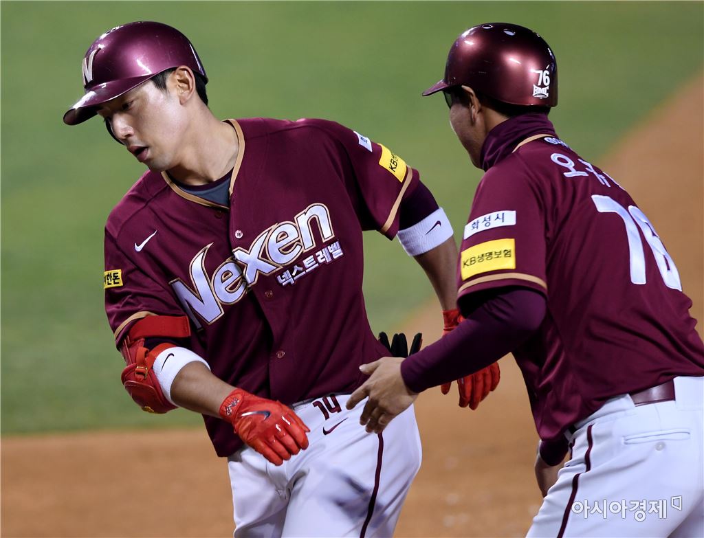 [아시아경제 김현민 기자]프로야구 넥센 히어로즈와 두산 베어스의 2017 KBO리그 경기가 7일 잠실구장에서 열렸다. 4회초 넥센 선두타자 서건창이 두산 선발 니퍼트를 상대로 동점 솔로 홈런을 치고 오규택 코치와 하이파이브하고 있다. 김현민 기자 kimhyun81@asiae.co.kr<ⓒ세계를 보는 창 경제를 보는 눈, 아시아경제(www.asiae.co.kr) 무단전재 배포금지>