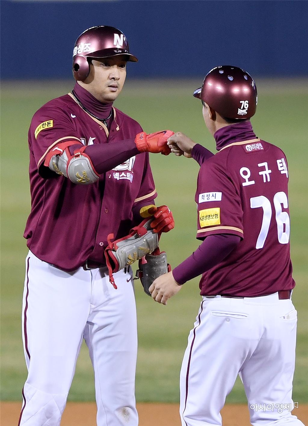 [아시아경제 김현민 기자]프로야구 넥센 히어로즈와 두산 베어스의 2017 KBO리그 경기가 7일 잠실구장에서 열렸다. 5회초 2사에서 넥센 채태인이 추가 1타점 2루타를 치고 출루한 뒤 오규택 코치와 하이파이브하고 있다.김현민 기자 kimhyun81@asiae.co.kr<ⓒ세계를 보는 창 경제를 보는 눈, 아시아경제(www.asiae.co.kr) 무단전재 배포금지>