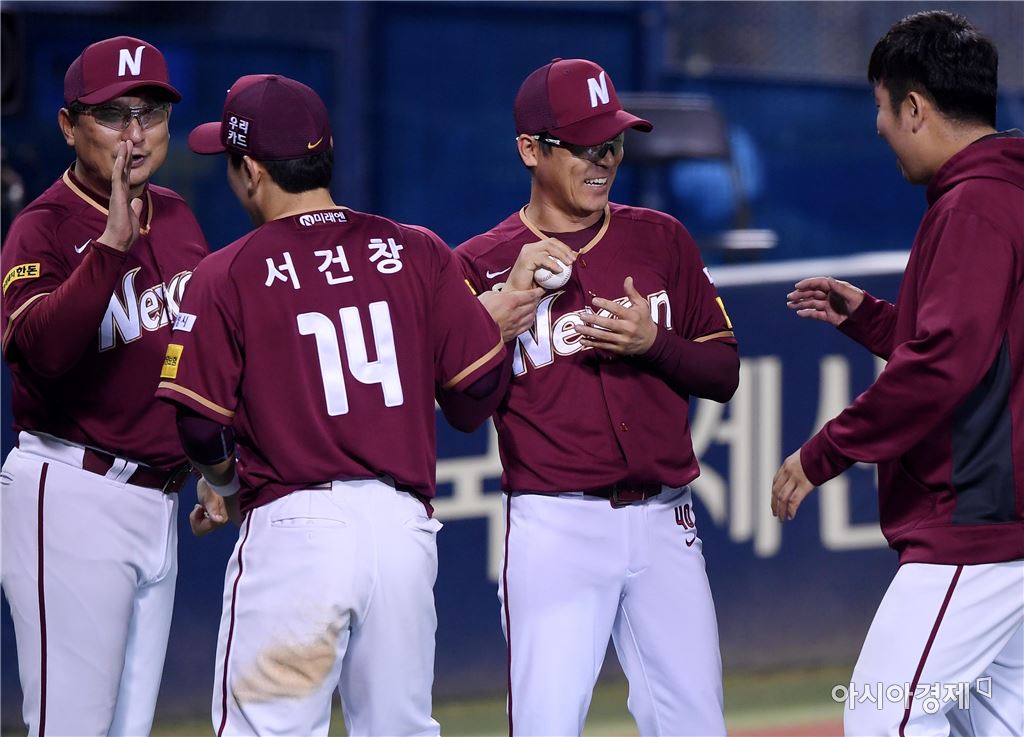 [아시아경제 김현민 기자]프로야구 넥센 히어로즈와 두산 베어스의 2017 KBO리그 경기가 7일 잠실구장에서 열렸다. 넥센 장정석 감독이 7-3 승리를 확정한 뒤 서건창으로부터 데뷔 첫 승 기념구를 건네받고 있다.