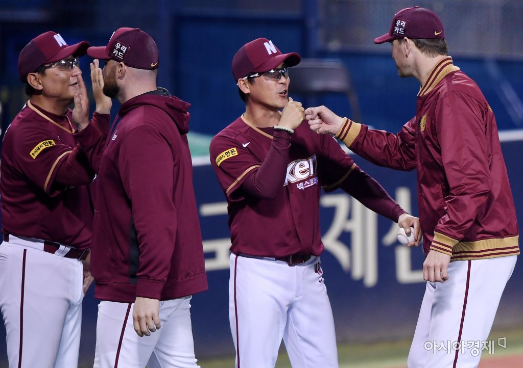 [아시아경제 김현민 기자]프로야구 넥센 히어로즈와 두산 베어스의 2017 KBO리그 경기가 7일 잠실구장에서 열렸다. 넥센 장정석 감독이 7-3 승리를 확정한 뒤 밴헤켄과 기뻐하고 있다.