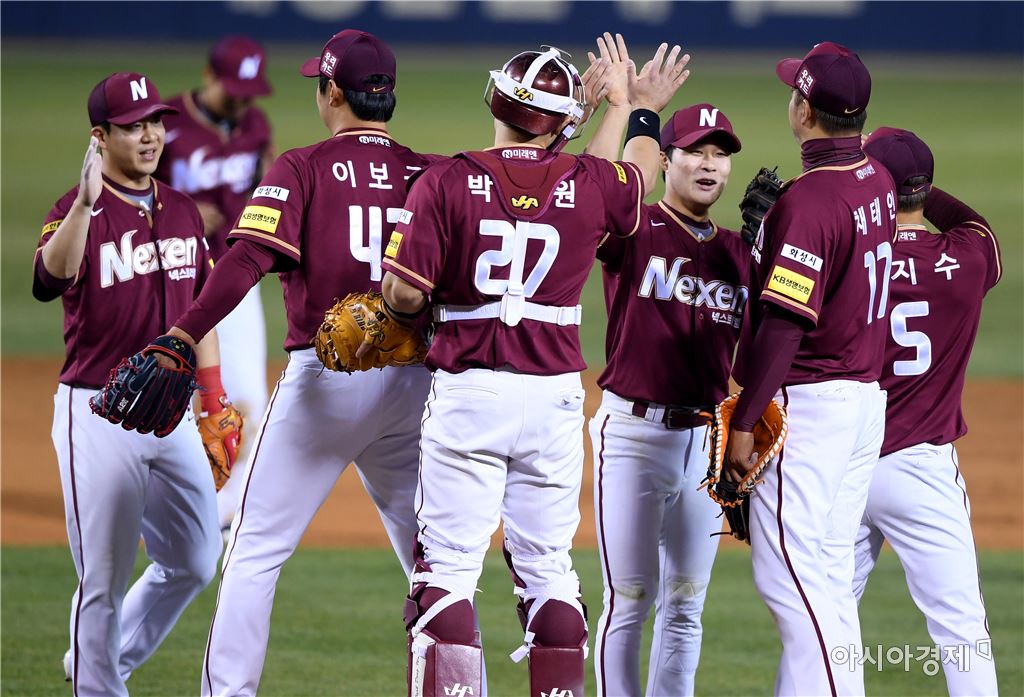 [아시아경제 김현민 기자]프로야구 넥센 히어로즈와 두산 베어스의 2017 KBO리그 경기가 7일 잠실구장에서 열렸다. 넥센 선수들이 7-3 승리를 확정한 뒤 기뻐하고 있다.김현민 기자 kimhyun81@asiae.co.kr<ⓒ세계를 보는 창 경제를 보는 눈, 아시아경제(www.asiae.co.kr) 무단전재 배포금지>