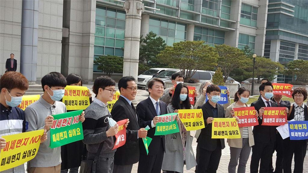 안철수 국민의당 대선후보가 8일 한양대학교에서 열린 '환경이 안보다' 미세먼지 대책간담회에 앞서 참석자들과 기념촬영을 하고 있다.