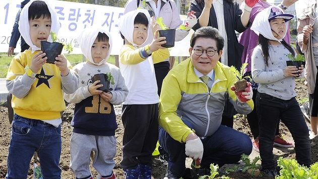 10일 오전 광진구 중곡3동 중랑천변 자투리텃밭에서 열린 ‘2017 중랑천 자투리텃밭 개장’에 참여한 김기동 광진구청장(왼쪽 네 번째)이 어린이들과 함께 모종을 심고 있다.