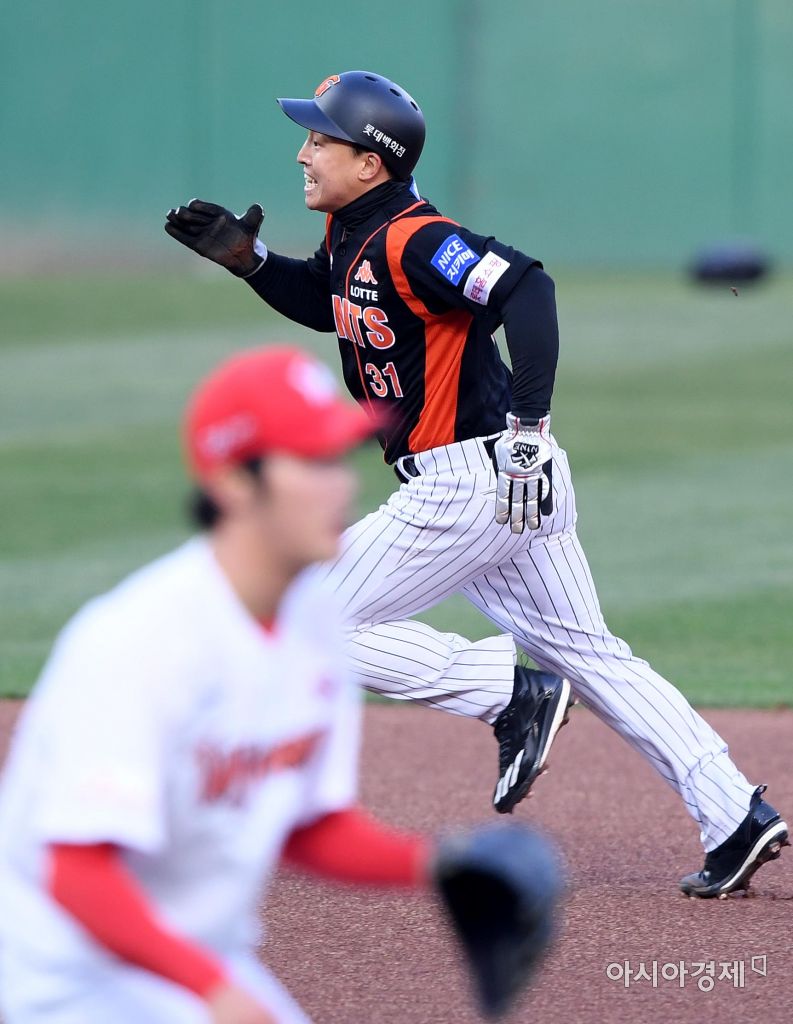[인천=아시아경제 김현민 기자] 프로야구 롯데 자이언츠와 SK 와이번스의 2017 KBO리그 경기가 11일 인천 SK행복드림구장에서 열렸다. 1회초 무사 1루에서 롯데 김문호 타석 때 1루주자 손아섭이 투수 견제 실책을 틈타 3루까지 진루하고 있다.
