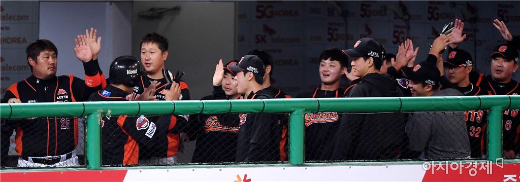 [인천=아시아경제 김현민 기자] 프로야구 롯데 자이언츠와 SK 와이번스의 2017 KBO리그 경기가 11일 인천 SK행복드림구장에서 열렸다. 6회초 2사 1,2루에서 롯데 손아섭의 추가 2타점 2루타 때 득점을 올린 강민호, 이우민이 동료들의 환영을 받고 있다. 김현민 기자 kimhyun81@asiae.co.kr<ⓒ세계를 보는 창 경제를 보는 눈, 아시아경제(www.asiae.co.kr) 무단전재 배포금지>