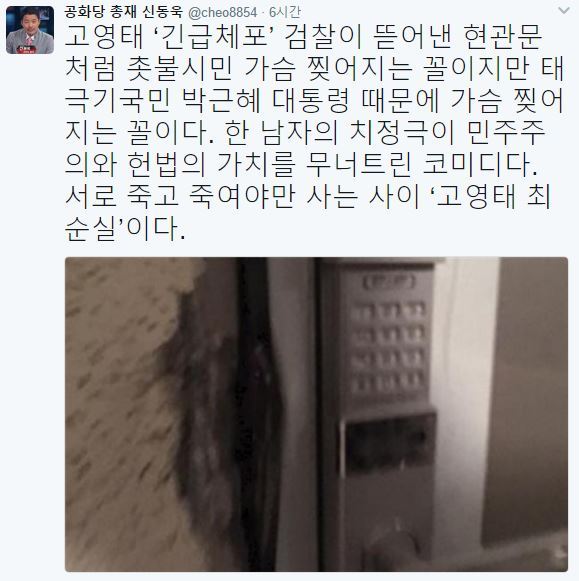 검찰이 고영태 전 더블루케이 이사(41)를 11일 긴급체포한 가운데, 신동욱 공화당 총재는 “한 남자의 치정극이 민주주의와 헌법의 가치를 무너뜨린 코미디다”고 밝혔다. 12일 신동욱 총재는 자신의 트위터를 통해 “고영태 ‘긴급체포’ 검찰이 뜯어낸 현관문처럼 촛불시민 가슴 찌어지는 꼴이지만 태극기국민 박근혜 대통령 때문에 가슴 찢어지는 꼴이다”라는 글을 게재했다. 이어 그는 “서로 죽고 죽여야만 사는 사이 ‘고영태 최순실’이다”고 덧붙였다. 검찰 특별수사본부(본부장 이영렬 서울중앙지검장)는 11일 고 전 이사에 대한 체포 영장을 발부받아 그를 긴급체포했다. 검찰 관계자는 “고씨가 관세청 고위직 인사에 개입하고 2000만원가량을 받은 정황이 드러나 체포했다”며 “추가 증거 수집 및 보강 수사를 위해 고 전 이사의 경기도 수원 집을 압수수색했다고 밝혔다. 한편, 검찰은 48시간 동안 추가 조사를 하고 고 전 이사에 대한 구속영장을 청구할 방침이다.<center><div class="slide_frame"><input type="hidden" id="slideIframeId" value="2016122811123809550A">