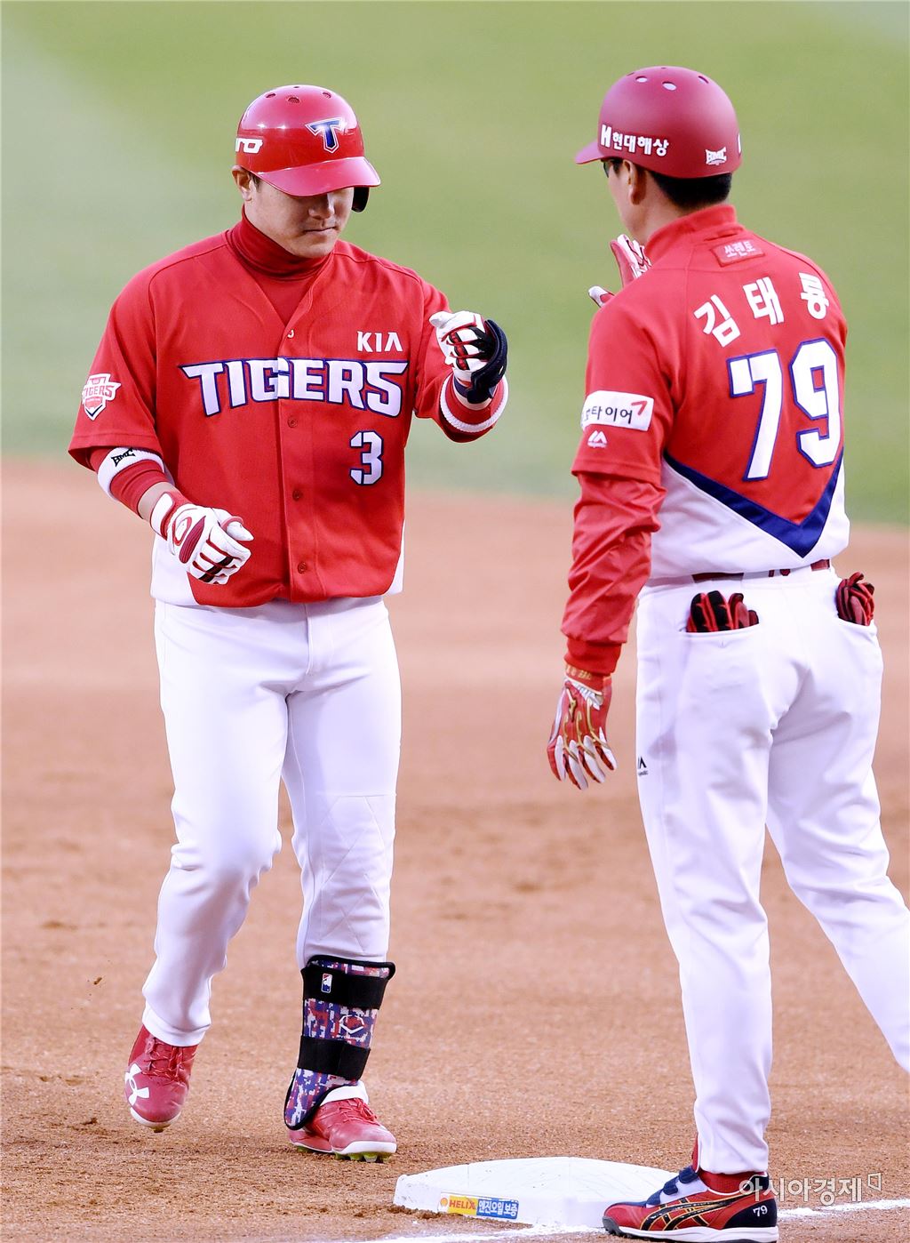 [아시아경제 김현민 기자]프로야구 KIA 타이거즈와 두산 베어스의 2017 KBO리그 경기가 12일 잠실구장에서 열렸다. 1회초 1사에서 KIA 김선빈이 중전 안타를 치고 출루한 뒤 김태룡 코치와 하이파이브하고 있다. 김현민 기자 kimhyun81@asiae.co.kr<ⓒ세계를 보는 창 경제를 보는 눈, 아시아경제(www.asiae.co.kr) 무단전재 배포금지>