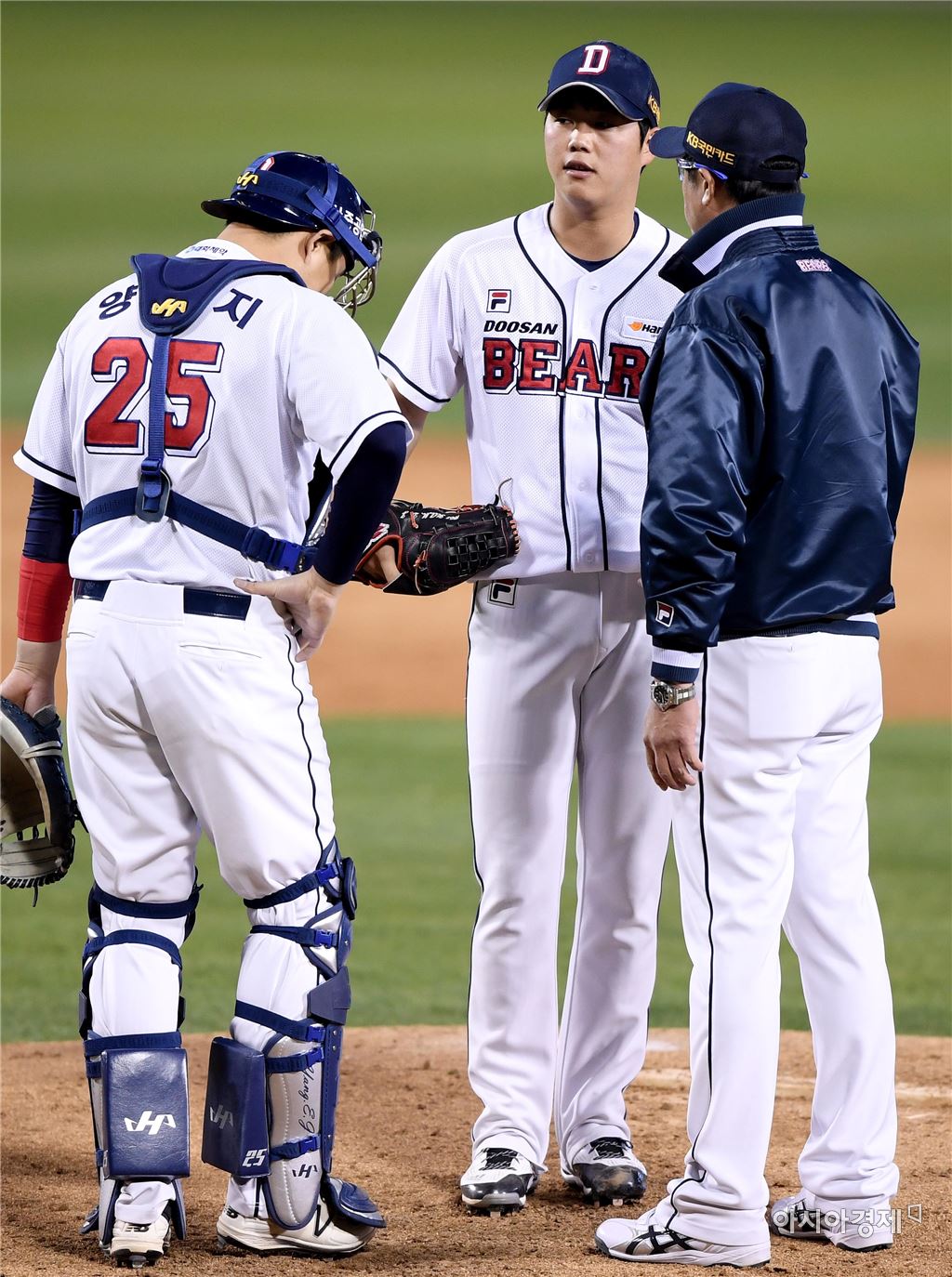 [아시아경제 김현민 기자]프로야구 KIA 타이거즈와 두산 베어스의 2017 KBO리그 경기가 12일 잠실구장에서 열렸다. 두산 선발투수 함덕주가 3회초 야수 실책과 행운의 안타로 2실점한 뒤 권명철 투수코치와 이야기하고 있다.김현민 기자 kimhyun81@asiae.co.kr<ⓒ세계를 보는 창 경제를 보는 눈, 아시아경제(www.asiae.co.kr) 무단전재 배포금지>