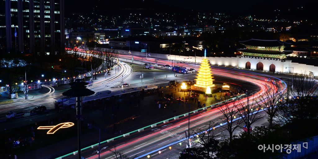 [아시아경제 문호남 수습기자] 불기 2561년의 부처님 오신 날을 21일 앞둔 12일 서울 종로구 광화문 광장에서 미륵사지 석탑등 점등식이 열리고 있다. 이날 점등된 석탑등은 국보 제11호의 미륵사지 석탑을 원형으로 삼아 제작돼 부처님 오신 날인 내달 3일까지 광화문 광장을 밝힌다.문호남 수습기자 munonam@asiae.co.kr<ⓒ세계를 보는 창 경제를 보는 눈, 아시아경제(www.asiae.co.kr) 무단전재 배포금지>