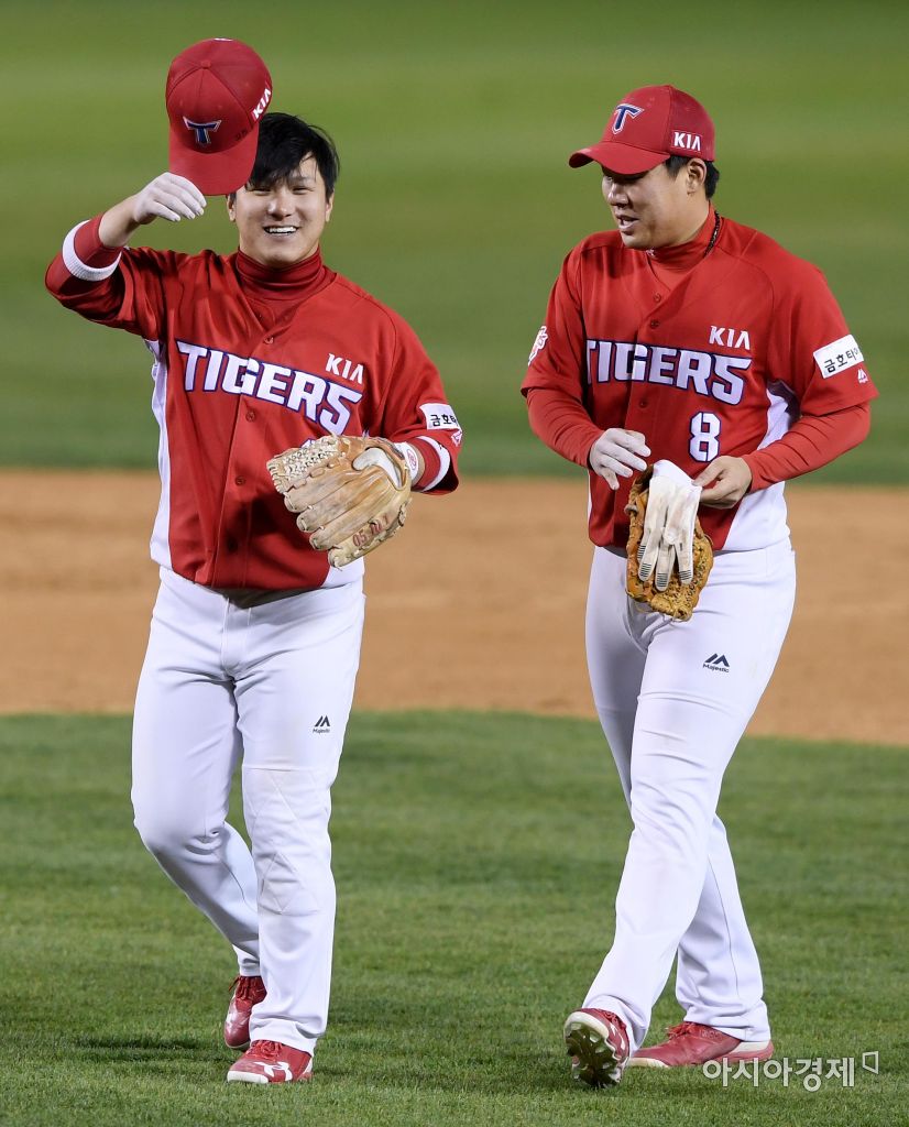 [아시아경제 김현민 기자]프로야구 KIA 타이거즈와 두산 베어스의 2017 KBO리그 경기가 12일 잠실구장에서 열렸다. KIA 김선빈과 안치홍이 8-4 승리를 확정한 뒤 기뻐하고 있다. 김현민 기자 kimhyun81@asiae.co.kr<ⓒ세계를 보는 창 경제를 보는 눈, 아시아경제(www.asiae.co.kr) 무단전재 배포금지>