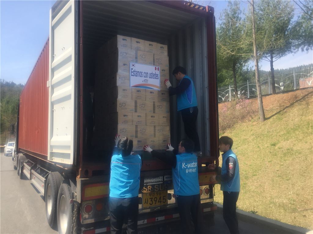 수공 직원들이 구호용 병입 수돗물을 콘테이너 차량에 적재하고 있다. <br />