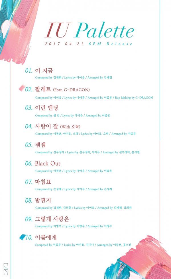 가수 아이유의 정규 4집 ‘팔레트’(Palette) 트랙리스트가 공개됐다.아이유의 소속사 페이브엔터테인먼트는 13일 아이유의 공식 SNS 등을 통해 정규 4집 ‘팔레트’의 전곡 트랙리스트를 깜짝 공개했다.아이유 새 앨범 '팔레트'의 트랙리스트/사진=아이유 인스타그램 캡처