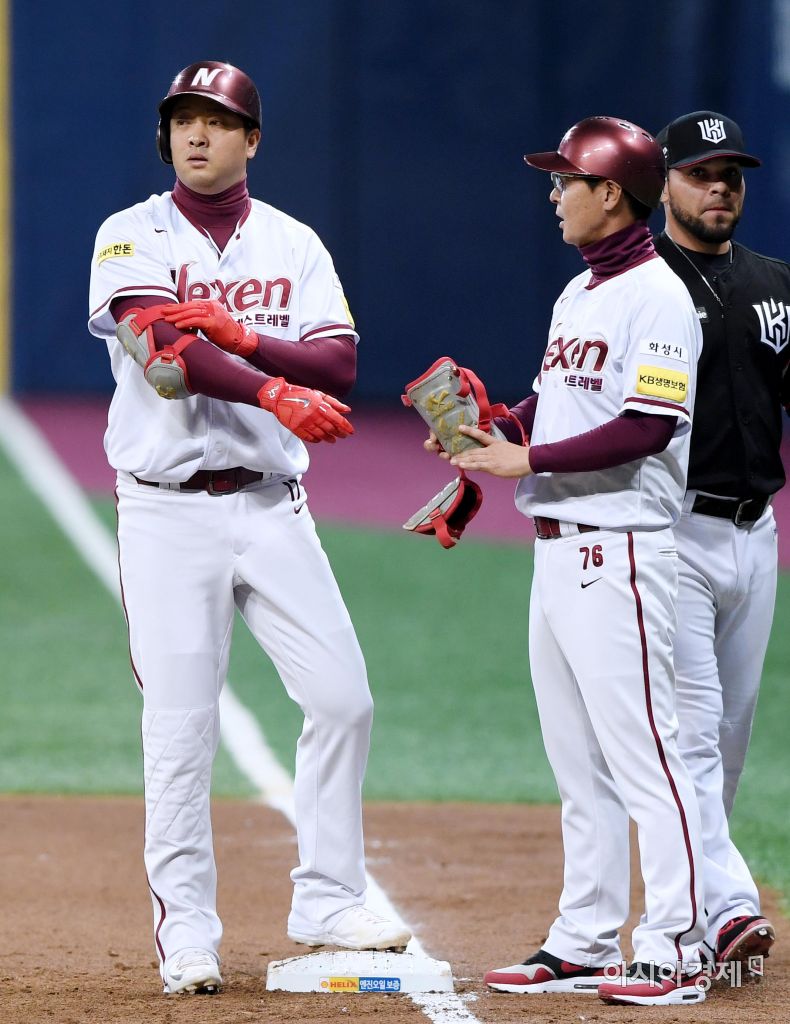 [아시아경제 김현민 기자]프로야구 kt 위즈와 넥센 히어로즈의 2017 KBO리그 경기가 13일 고척돔에서 열렸다. 1회말 1사 만루에서 넥센 채태인이 선취 2타점 적시타를 치고 오규택 코치와 하이파이브하고 있다. 김현민 기자 kimhyun81@asiae.co.kr<ⓒ세계를 보는 창 경제를 보는 눈, 아시아경제(www.asiae.co.kr) 무단전재 배포금지>