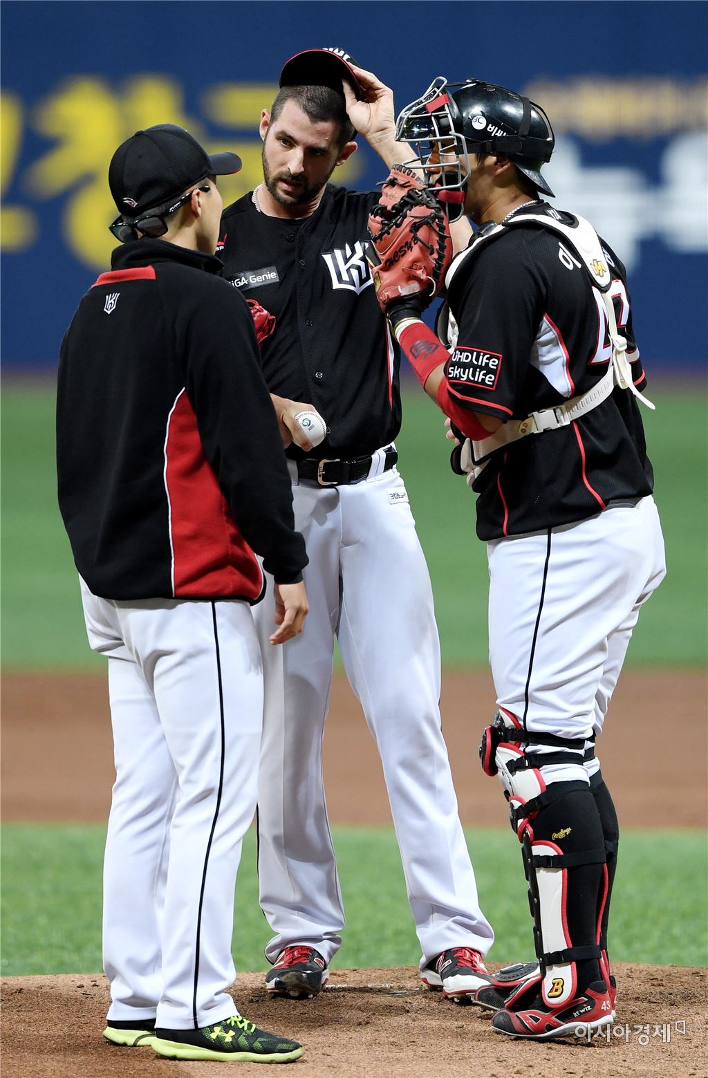 [아시아경제 김현민 기자]프로야구 kt 위즈와 넥센 히어로즈의 2017 KBO리그 경기가 13일 고척돔에서 열렸다. kt 선발투수 로치가 1회말 1사 만루에서 넥센 채태인에게 선취 2타점을 허용한 뒤 이해창 포수와 대화하고 있다. 김현민 기자 kimhyun81@asiae.co.kr<ⓒ세계를 보는 창 경제를 보는 눈, 아시아경제(www.asiae.co.kr) 무단전재 배포금지>