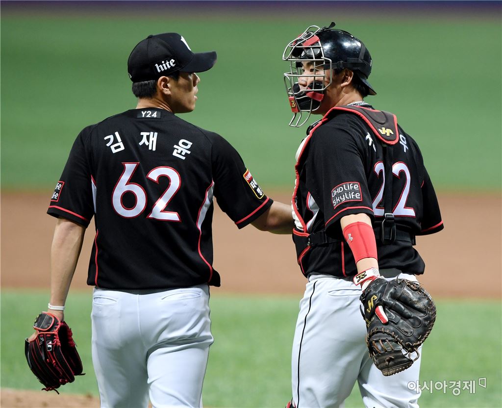 [아시아경제 김현민 기자]프로야구 kt 위즈와 넥센 히어로즈의 2017 KBO리그 경기가 13일 고척돔에서 열렸다. kt 마무리 김재윤이 7-6 승리를 확정한 뒤 장성우 포수와 기뻐하고 있다. 김현민 기자 kimhyun81@asiae.co.kr<ⓒ세계를 보는 창 경제를 보는 눈, 아시아경제(www.asiae.co.kr) 무단전재 배포금지>