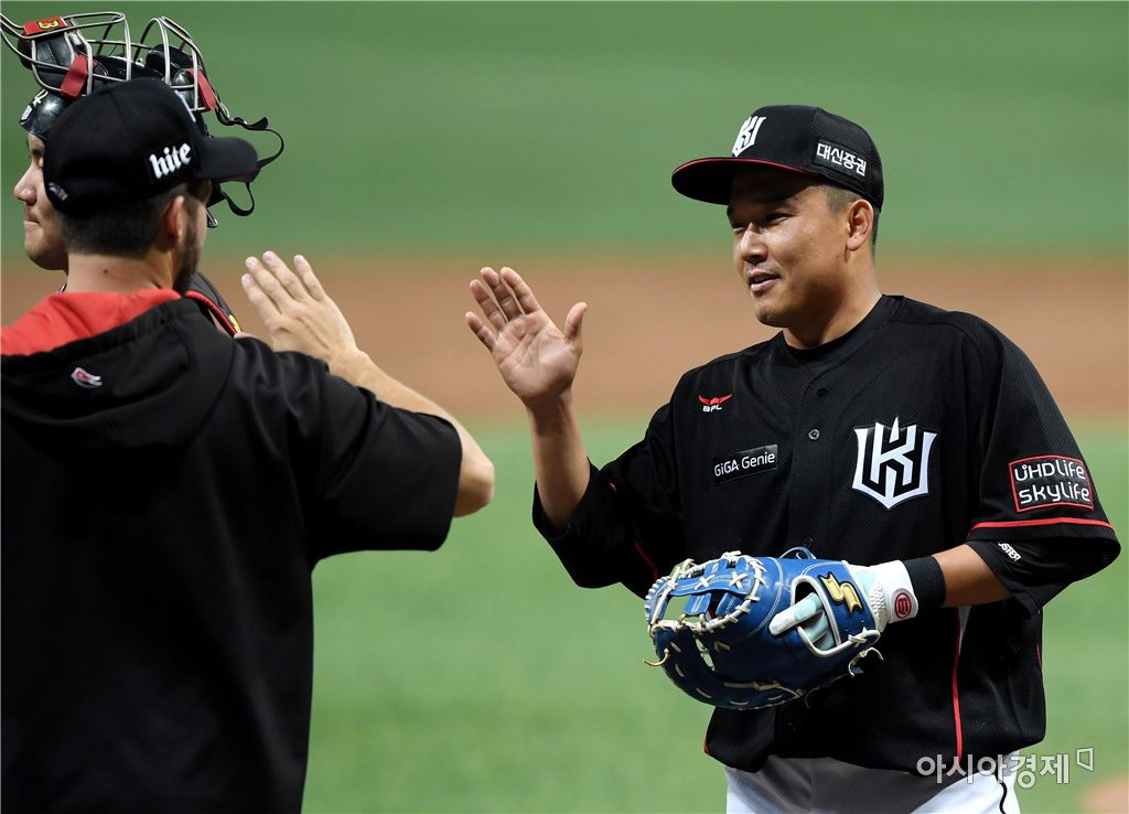 [아시아경제 김현민 기자]프로야구 kt 위즈와 넥센 히어로즈의 2017 KBO리그 경기가 13일 고척돔에서 열렸다. kt 윤요섭이 7-6 승리를 확정한 뒤 동료들과 기뻐하고 있다. 김현민 기자 kimhyun81@asiae.co.kr<ⓒ세계를 보는 창 경제를 보는 눈, 아시아경제(www.asiae.co.kr) 무단전재 배포금지>