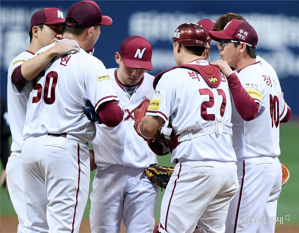 [아시아경제 김현민 기자]프로야구 kt 위즈와 넥센 히어로즈의 2017 KBO리그 경기가 13일 고척돔에서 열렸다. 넥센 장정석 감독이 9회초 2사 1,2루의 위기에서 선수들을 마운드로 불러 모아 이야기를 하고 있다. 김현민 기자 kimhyun81@asiae.co.kr<ⓒ세계를 보는 창 경제를 보는 눈, 아시아경제(www.asiae.co.kr) 무단전재 배포금지>