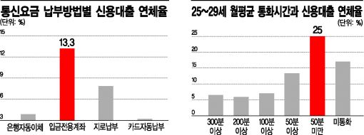 지난 12일 SK텔레콤이 연 '4차 산업혁명 대비 빅데이터 개인정보 비식별화 실증 세미나'에서는 흥미로운 신용대출 연체자들의 특징이 소개됐다. SK텔레콤과 한화생명이 두 회사 가입자의 비식별 개인정보를 활용한 빅데이터 분석 결과다. 이로써 통신 데이터를 활용한 중금리 대상자의 신용도 상향 보정 가능성 검증을 통해 가계경제 위험도를 낮출 수 있는 가능성을 발견·검증할 수 있게 됐다.두 회사의 연구는 SK텔레콤의 1802만 가입자와 한화생명의 459만 가입자 중 양쪽 모두에 가입된 218만명을 대상으로 이뤄졌다. 그 결과 이동통신 전화통화량과 신용대출 연체의 유의미한 상관관계가 나타났다. 통화시간이 없거나 통화 빈도가 낮은 고객의 경우 신용대출 연체율이 다소 높다는 점이 발견된 것이다. 특히 20대의 경우에 그 차이가 심했다. 예를 들어 월평균 통화시간이 300분 이상인 20대의 경우 신용대출 연체율이 6.5%였지만 50분 미만인 사람의 경우는 25%에 달했다.통신비 납부 방법도 변수다. 은행자동이체나 카드자동납부를 이용하는 고객의 신용대출 연체율은 각각 3.9%, 3.2%로 나타났다. 반면 지로납부 고객은 7.7%, 입금전용계좌 고객은 13.3%로 높은 수치를 나타냈다.