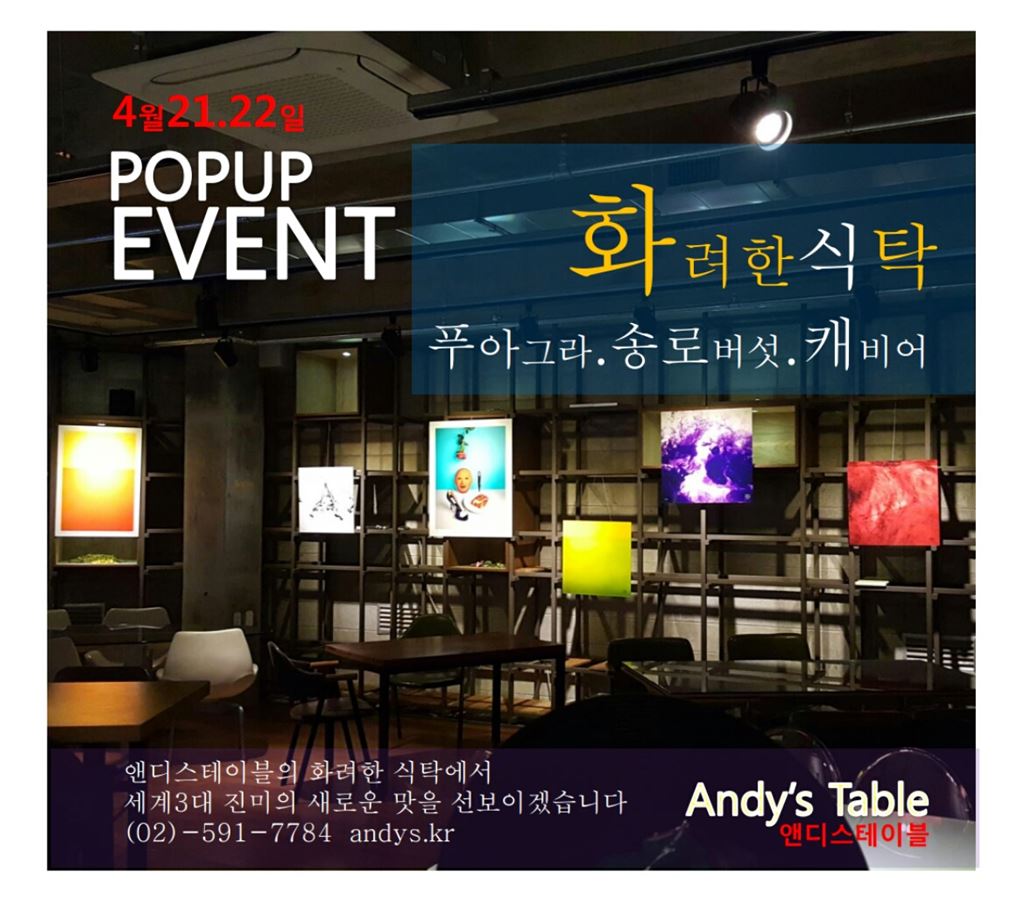 [아시아경제 오주연 기자]국내 최초 팝업 전문 레스토랑 앤디스테이블이 오는 21일부터 22일까지 이틀간 ‘서래마을의 화려한 식탁’이라는 주제로 세계 3대 진미로 널리 알려진 송로버섯과 푸아그라, 캐비어를 활용한 최고급 안심과 랍스터 요리를 선보인다고 14일 밝혔다.서래마을에 위치한 앤디스테이블은 그동안 미쉐린 스타 출신 외국 셰프들과 함께 매월 팝업 이벤트행사를 진행했으며 매월 세계 각국의 다양한 요리를 선보여 왔다. 이번에 열리는 팝업 이벤트에서는 영국 미쉐린이 선정한 레스토랑 ‘galvin at window’를 거쳐 한국 루카 511에서 헤드셰프를 맡고 있는 이승진씨가 요리의 향연을 펼칠 예정이다.4월의 팝업 이벤트에서는 우리 고유의 식자재인 두릅과 완두콩, 톳 등을 활용해 우리고유의 향과 세계 3대 진미가 어우러지는 화려한 식탁을 경험할 수 있다. 또한 프랑스의 세계적인 명차 떼오도르와 구르메 치즈를 활용해 이승진 셰프만의 독창적인 프렌치 컨템퍼러리를 만날 수 있다. 99명 한정 예약제로 진행되고 있어 방문 전 사전 예약을 해야 한다. 오주연 기자 moon170@asiae.co.kr<ⓒ세계를 보는 창 경제를 보는 눈, 아시아경제(www.asiae.co.kr) 무단전재 배포금지>