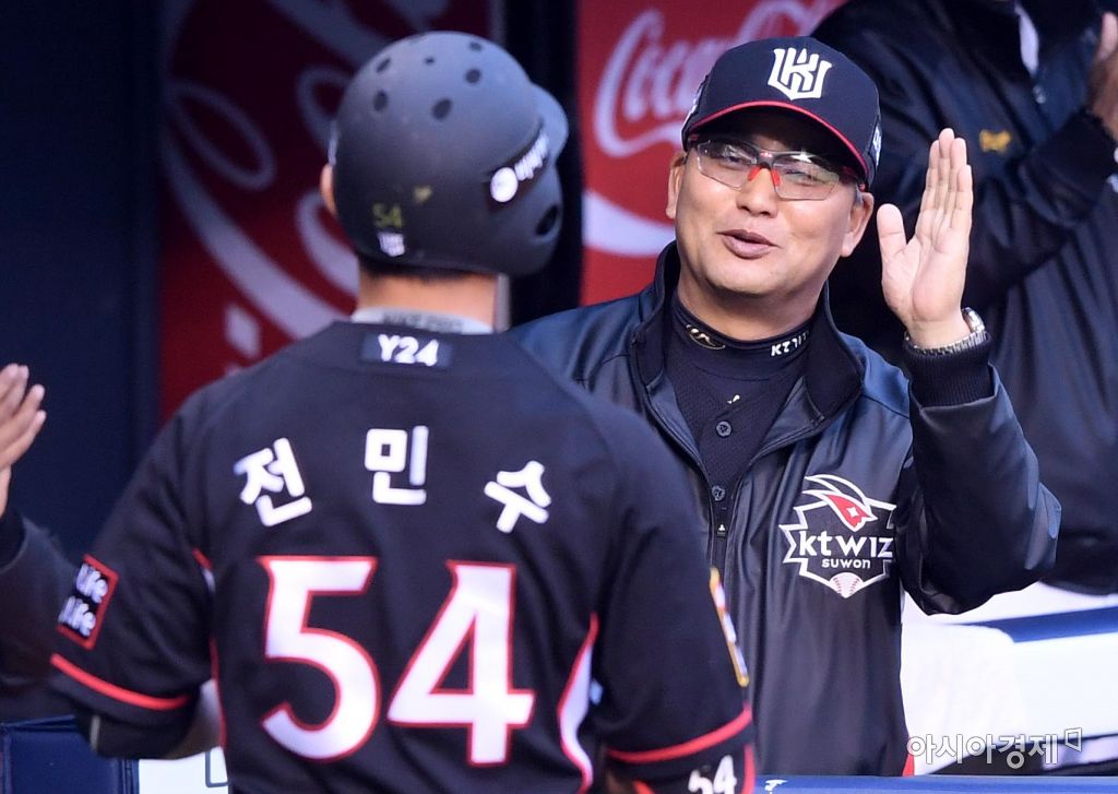 [아시아경제 김현민 기자]프로야구 kt 위즈와 LG 트윈스의 2017 KBO리그 경기가 14일 잠실구장에서 열렸다. 1회초 1사에서 kt 전민수가 LG 선발 류제국을 상대로 선제 솔로 홈런을 치고 채종범 코치와 기뻐하고 있다. 김현민 기자 kimhyun81@asiae.co.kr<ⓒ세계를 보는 창 경제를 보는 눈, 아시아경제(www.asiae.co.kr) 무단전재 배포금지>