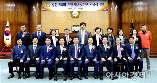 [아시아경제 노해섭 기자]광주 광산구의회(의장 조승유)가 개원 26주년을 맞았다. 광산구의회는 14일 오전 구의회 5층 본회의장에서 민형배 광산구청장, 김홍식 광주서부교육지원청 교육장, 시·구의원, 주민 등 100여명이 참석한 가운데 ‘개원 26주년 기념행사’를 열었다. 이날 기념식은 의정활동 영상 상영을 시작으로 의원윤리강령 낭독, 연혁 및 의정활동 보고, 기념사, 유공자 표창 등으로 이어졌다. 특히 지난 1년 동안 투철한 희생정신으로 광산구 지역사회 봉사와 의정발전에 기여한 공로가 큰 주민 22명과 공무원 1명 등 23명에게 표창패를 수여했다. 제7대 의회는 2014년 제199회 임시회를 시작으로 제227회 임시회까지 29번의 회기를 통해 413건의 각종 의안을 처리했다. 또한 2016년도 행정사무감사에서는 시정조치요구 18건, 처리요구사항 52건, 건의 90건 등 총 160건을 집행기관에 개선할 것을 요구하는 성과를 냈다. 조승유 의장은 “지방자치가 뿌리내리고 성숙한 의회로 성장하는 데 힘을 준 41만 구민에게 감사한다”며 ?년의 역사를 밑거름으로 앞으로도 민주적이고 생산적인 의정활동에 주력할 것”이라고 밝혔다. 이어 조 의장은 “풀뿌리 민주주의를 위해 혼신의 힘을 다해 헌신한 선배의원과 동료의원에게도 감사드린다”며 “섬기는 의회, 일하는 의회, 가까운 의회로 발전할 수 있도록 최선을 다하겠다”고 말했다. 한편 1991년 출범한 광산구의회는 현재 제7대 의회에 이르기까지 변화된 시대상에 걸맞은 적극적 혁신과 도덕성 강화를 통해 구민과 소통하는 의회로 자리매김 해왔다.노해섭 기자 nogary@<ⓒ세계를 보는 창 경제를 보는 눈, 아시아경제(www.asiae.co.kr) 무단전재 배포금지>