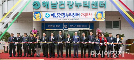 "건강생활 실천 맞춤형 관리서비스 제공, 군민건강 증진 기대"[아시아경제 노해섭 기자]해남군민들의 생활 속 건강을 책임질 해남건강누리센터가 18일 개관했다. 연면적 836.39㎡, 지상 2층 규모로 군 보건소 옆 부지에 신축된 건강누리센터는 군민 건강관리 및 증진을 위한 맞춤형 관리 서비스를 제공하게 된다. 센터 내 1층에는 38대의 각종 체력·근력장비가 비치된 체력 측정 및 체력 단련실이 위치해 있고 2층에는 고혈압, 당뇨, 비만 등 만성질환 예방과 관리를 위한 건강증진 프로그램실, 건강관리실을 운영한다. 특히 건강누리센터에서는 군민들이 평상시 건강생활을 실천할 수 있도록 개인별 진단과 평가 등 건강정보를 제공하고, 각종 프로그램을 운영하는 상설건강교육장으로서 분야별 원스톱서비스를 구축하게 된다. 이를 통해 기초체력 관리부터 고위험군 건강관리 프로그램까지 맞춤형 건강증진 서비스를 제공해 예방 중심의 건강관리에 큰 역할을 할 수 있을 것으로 기대되고 있다.