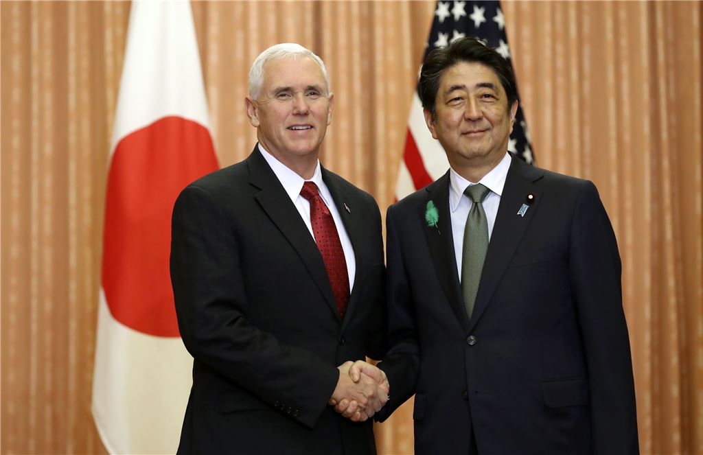 18일 마이크 펜스 미국 부통령과 아베신조 일본 총리가 회담에 앞서 악수하고 있다. (사진=EPA연합)