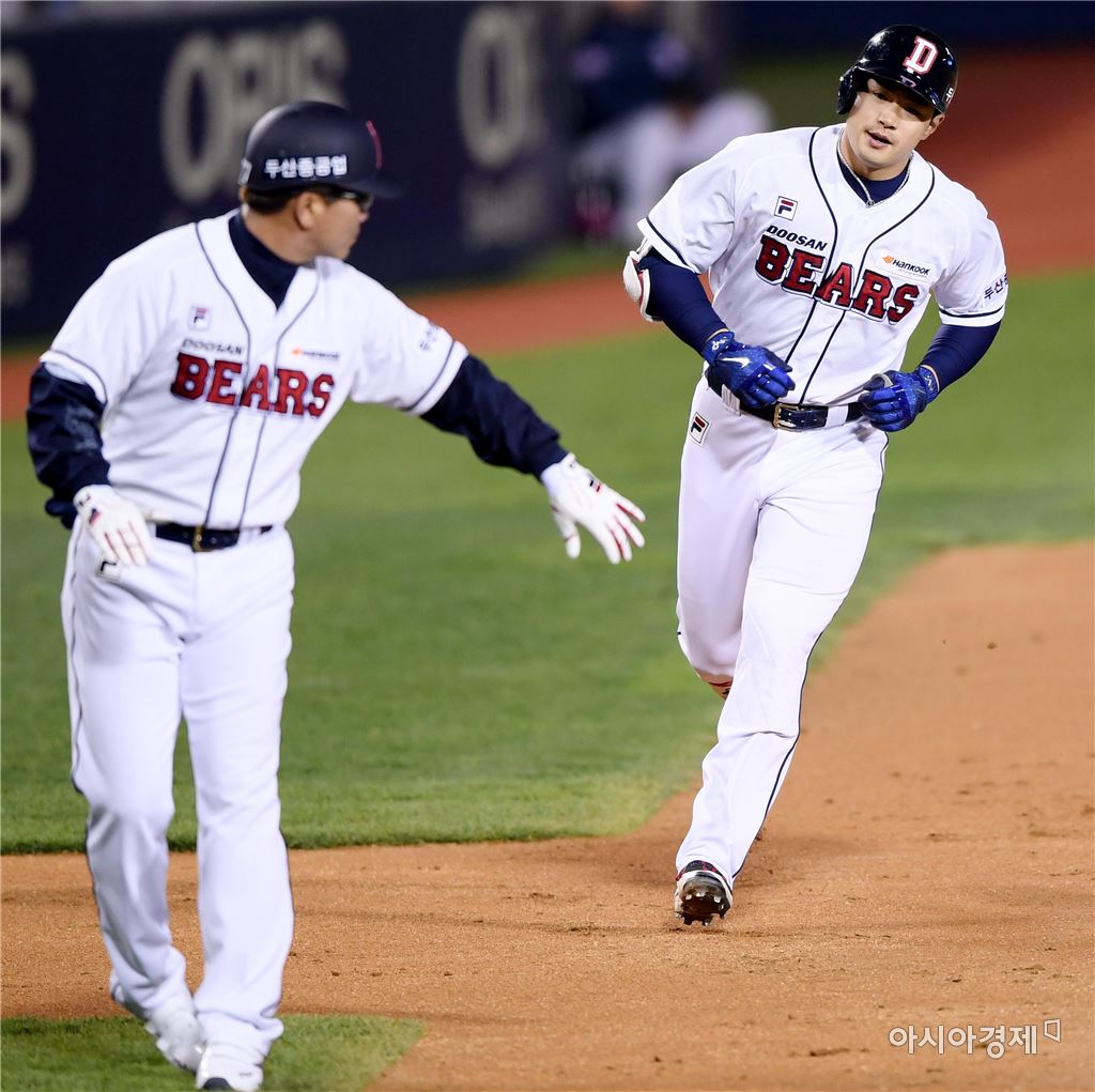 [아시아경제 김현민 기자]프로야구 삼성 라이온즈와 두산 베어스의 2017 KBO리그 경기가 19일 잠실구장에서 열렸다. 4회말 1사에서 두산 김재환이 삼성 김대우를 상대로 선제 솔로 홈런을 치고 전형도 코치와 하이파이브하고 있다. 김현민 기자 kimhyun81@asiae.co.kr<ⓒ세계를 보는 창 경제를 보는 눈, 아시아경제(www.asiae.co.kr) 무단전재 배포금지>