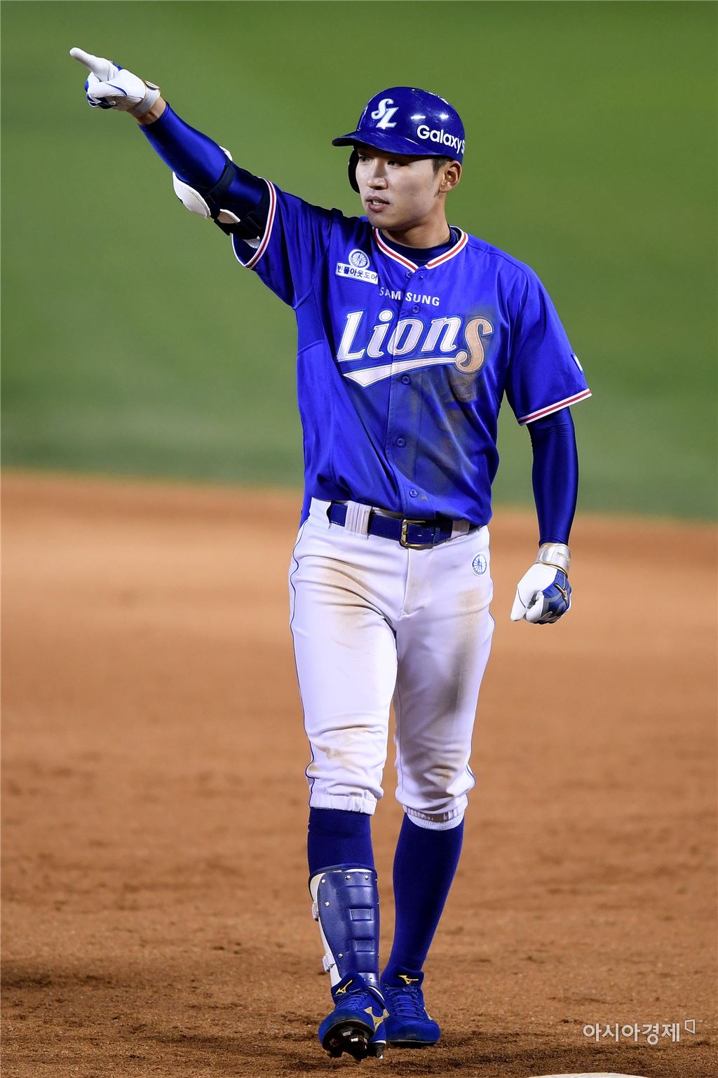 [아시아경제 김현민 기자]프로야구 삼성 라이온즈와 두산 베어스의 2017 KBO리그 경기가 19일 잠실구장에서 열렸다. 8회초 2사 1,3루에서 삼성 박해민이 동점 1타점 적시타를 치고 더그아웃을 향해 손짓하고 있다. 김현민 기자 kimhyun81@asiae.co.kr<ⓒ세계를 보는 창 경제를 보는 눈, 아시아경제(www.asiae.co.kr) 무단전재 배포금지>