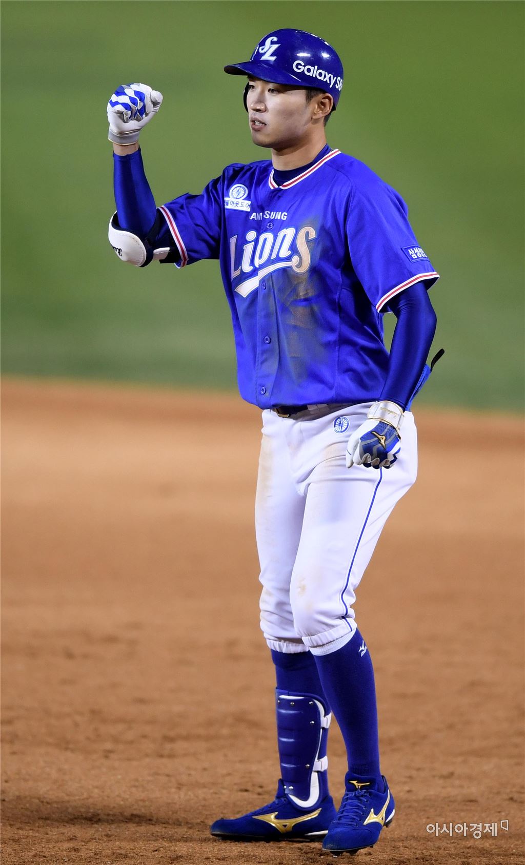 [아시아경제 김현민 기자]프로야구 삼성 라이온즈와 두산 베어스의 2017 KBO리그 경기가 19일 잠실구장에서 열렸다. 8회초 2사 1,3루에서 삼성 박해민이 동점 1타점 적시타를 치고 환호하고 있다. 김현민 기자 kimhyun81@asiae.co.kr<ⓒ세계를 보는 창 경제를 보는 눈, 아시아경제(www.asiae.co.kr) 무단전재 배포금지>