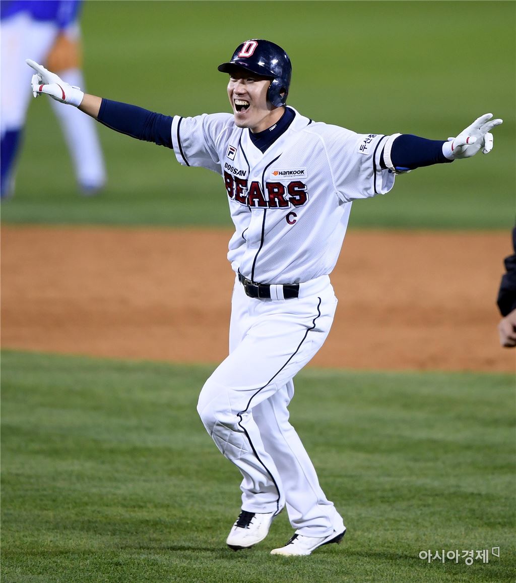 [아시아경제 김현민 기자]프로야구 삼성 라이온즈와 두산 베어스의 2017 KBO리그 경기가 19일 잠실구장에서 열렸다. 9회말 2사 2루에서 두산 김재호가 끝내기 안타를 치고 환호하고 있다. 두산의 2-1 승리.김현민 기자 kimhyun81@asiae.co.kr<ⓒ세계를 보는 창 경제를 보는 눈, 아시아경제(www.asiae.co.kr) 무단전재 배포금지>