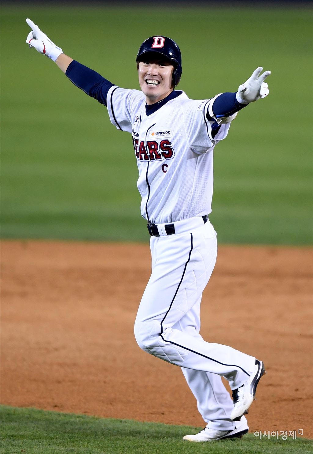 [아시아경제 김현민 기자]프로야구 삼성 라이온즈와 두산 베어스의 2017 KBO리그 경기가 19일 잠실구장에서 열렸다. 9회말 2사 2루에서 두산 김재호가 끝내기 안타를 치고 환호하고 있다. 두산의 2-1 승리.김현민 기자 kimhyun81@asiae.co.kr<ⓒ세계를 보는 창 경제를 보는 눈, 아시아경제(www.asiae.co.kr) 무단전재 배포금지>