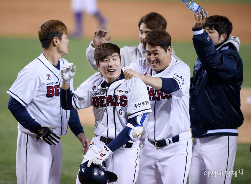 [아시아경제 김현민 기자]프로야구 삼성 라이온즈와 두산 베어스의 2017 KBO리그 경기가 19일 잠실구장에서 열렸다. 9회말 2사 2루에서 두산 김재호가 끝내기 안타를 치고 동료들과 기뻐하고 있다. 2-1 승리.김현민 기자 kimhyun81@asiae.co.kr<ⓒ세계를 보는 창 경제를 보는 눈, 아시아경제(www.asiae.co.kr) 무단전재 배포금지>