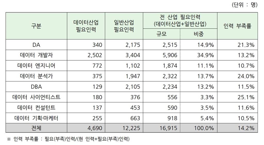 데이터는 4차산업혁명의 핵심으로 평가받는다. 자사의 고객데이터를 활용하는 것은 물론, 타 산업과의 데이터 교류를 통해 유의미한 정보를 추출해내는데 온 기업들이 힘을 기울이고 있다. 특히 금융권에서는 '데이터 없이는 의사결정을 할 수 없다'는 분위기가 자리잡고 있다. 데이터가 많고 의미 있는 정보를 끄집어내는 역량이 뛰어날수록 의사결정을 쉽게 할 수 있고, 고객 서비스 품질도 향상되기 때문이다.이런 경향과 함께 데이터베이스관리시스템(DBMS) 등 솔루션 시장도 성장하고 있다. 데이터 활용에 도움을 주는 컨설팅 시장을 중심으로 전문 인력도 증가세다.일반산업을 포함해 전 산업의 데이터직무 인력은 2016년 총 10만2375명으로 전년 대비 1.9% 늘었다. 데이터직무별로는 데이터 개발자가 2016년 3만8948명으로 가장 큰 비중을 차지했다. 이어서 데이터베이스관리자(DBA)가 1만7116명, 데이터 엔지니어가 1만5670명 순으로 나타났다.2016년 빅데이터 관련 필요인력 및 부족률