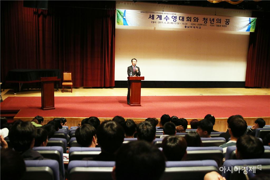 [아시아경제 노해섭 기자]남부대학교(총장 조성수)는 20일 협동관 대강당에서 오후 1시 30분 세계수영선수권대회 조직위원회 조영택 사무총장을 초청해 특강을 실시했다.이날 조영택 사무총장은 200여명의 재학생을 대상으로 ‘세계수영대회와 청년의 꿈’라는 주제로 특강을 했다.한편 2019 세계수영선수권대회는 남부대국제수영장에서 개최될 예정이다. 노해섭 기자 nogary@<ⓒ세계를 보는 창 경제를 보는 눈, 아시아경제(www.asiae.co.kr) 무단전재 배포금지>