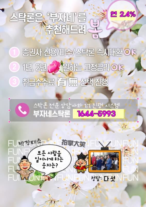 현재 국내 스탁론(연계신용) 잔고 규모는 무려 2조원 이상. 증권사 연계신용대출 거래 시작 이후 최대 규모인 만큼, 주식투자자들의 주요 자금마련 수단으로 점점 더 자리하고 있다. 이런 상황에서 가장 주목해 볼 만한 스탁론 기업이 있으니, 바로 머니투데이 MTN “부자네 스탁론.” 지난 2009년 설립 직후부터 지금까지 무려 8년 간 단 한 차례도 빠짐없이 스탁론 부분 단연 최우수 고객만족도를 이어나가고 있는 획기적인 스탁론 기업이다.우선 기존 스탁론 상품이 감히 따라올 수 없는 부자네 스탁론만의 최대 경쟁력은 취급수수료 0원. 그야말로 파격이 아닐 수 없는데, 이에 더불어 부자네의 상품은 최저금리이면서도 주식 매도 없이 대환대출까지도 가능하니 일석이조를 넘어 일섬삼조 이상의 업계 최고상품이라는 것이다.뻔히 매수할 종목이 눈앞에 보이는데도 주식자금이 부족해 아직도 망설이고 있는 투자자가 있다면, 지금 바로 《부자네 ☎ 1644-5993》에 부담 없이 문의하기 꼭 바란다. 고객 한 사람 한 사람의 투자성향과 투자기간에 꼭 맞춘 가장 최적의 상품을, 전문적이고 친절한 안내로 끝까지 맺어주고 있다. 온라인 신청으로 상담에서 신청, 입금까지 30분이면 모든 절차 완료다. ★ 부자네 BEST 5-2년 고정금리-연 2.4% 최저금리 / 마이너스식 합리적 이자 지불-주식 매도 없이 증권사 신용 / 타사 스탁론 최고 조건 즉시 대환-초기비용 + 연장 +중도수수료 전액 0원-현금 즉시 출금※부자네 바로가기 상담전화 ☎ 1644-5993고객들의 문의가 많은 종목으로는 삼부토건, 내츄럴엔도텍, 오공, 아남전자, 에스마크 등이 있다.※ 본 내용은 아시아경제 편집 방향과 무관하며, 모든 책임은 정보 제공자에게 있습니다.<ⓒ세계를 보는 창 경제를 보는 눈, 아시아경제(www.asiae.co.kr) 무단전재 배포금지>