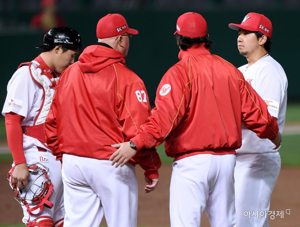 [인천=아시아경제 김현민 기자]프로야구 넥센 히어로즈와 SK와이번스의 2017 KBO리그 경기가 20일 인천 SK행복드림구장에서 열렸다. SK 선발 윤희상이 5회초 무사 2,3루의 위기에서 마운드를 방문한 데이브 존 코치와 대화하고 있다. 김현민 기자 kimhyun81@asiae.co.kr<ⓒ세계를 보는 창 경제를 보는 눈, 아시아경제(www.asiae.co.kr) 무단전재 배포금지>