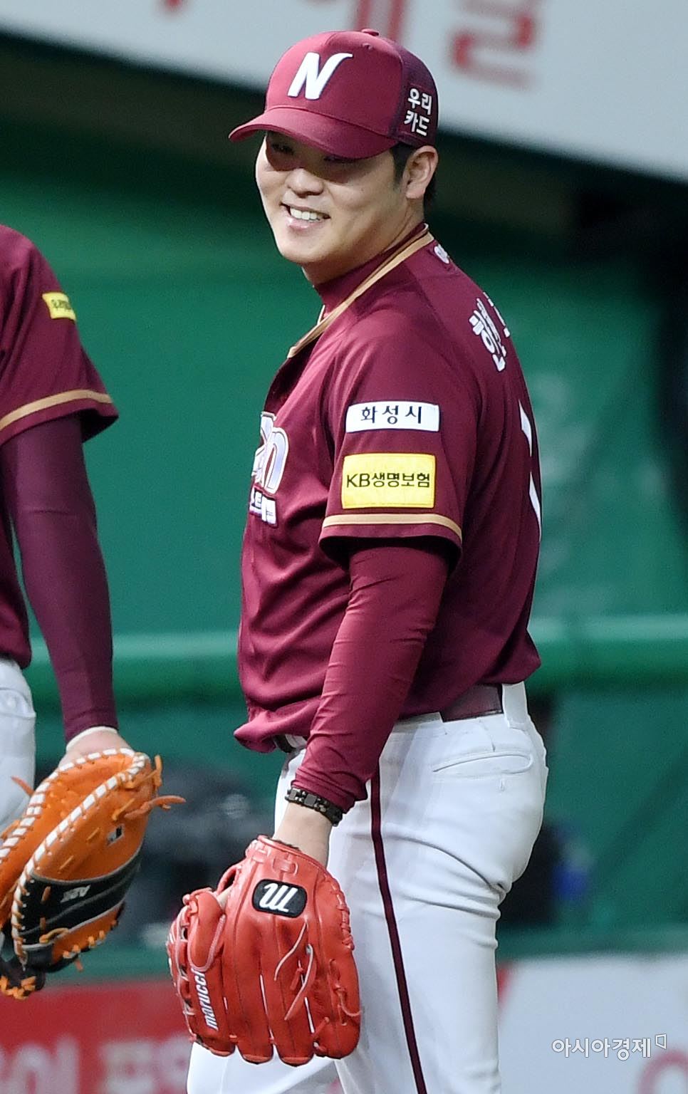 [인천=아시아경제 김현민 기자]프로야구 넥센 히어로즈와 SK와이번스의 2017 KBO리그 경기가 20일 인천 SK행복드림구장에서 열렸다. 넥센 선발투수 한현희가 5회말 수비를 마친 뒤 주효상 포스를 바라보며 미소 짓고 있다. 김현민 기자 kimhyun81@asiae.co.kr<ⓒ세계를 보는 창 경제를 보는 눈, 아시아경제(www.asiae.co.kr) 무단전재 배포금지>