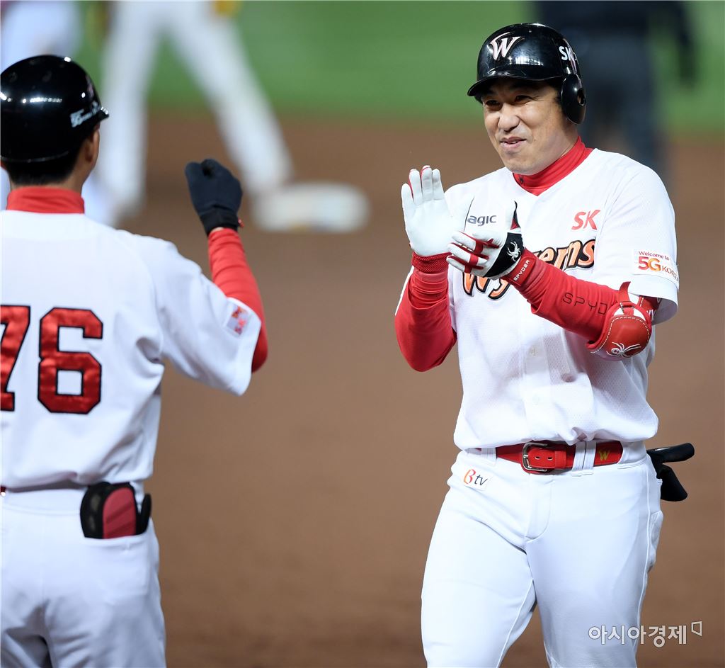 [인천=아시아경제 김현민 기자]프로야구 넥센 히어로즈와 SK와이번스의 2017 KBO리그 경기가 20일 인천 SK행복드림구장에서 열렸다. 7회말 2사에서 1,3루에서 SK 김강민이 동점 1타점 적시타를 치고 박수치며 기뻐하고 있다. 김현민 기자 kimhyun81@asiae.co.kr<ⓒ세계를 보는 창 경제를 보는 눈, 아시아경제(www.asiae.co.kr) 무단전재 배포금지>