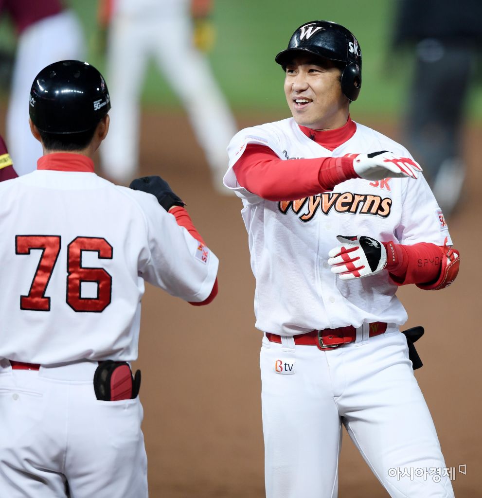 [인천=아시아경제 김현민 기자]프로야구 넥센 히어로즈와 SK와이번스의 2017 KBO리그 경기가 20일 인천 SK행복드림구장에서 열렸다. 7회말 2사에서 1,3루에서 SK 김강민이 동점 1타점 적시타를 치고 김인호 코치와 하이파이브하고 있다. 김현민 기자 kimhyun81@asiae.co.kr<ⓒ세계를 보는 창 경제를 보는 눈, 아시아경제(www.asiae.co.kr) 무단전재 배포금지>