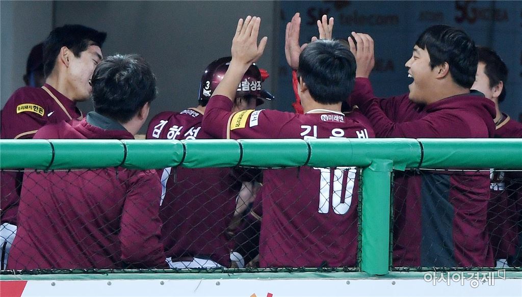 [인천=아시아경제 김현민 기자]프로야구 넥센 히어로즈와 SK와이번스의 2017 KBO리그 경기가 20일 인천 SK행복드림구장에서 열렸다. 8회초 2사 2루에서 넥센 김하성이 SK 박희수를 상대로 역전 투런 홈런을 치고 더그아웃의 동료들과 기뻐하고 있다. 김현민 기자 kimhyun81@asiae.co.kr<ⓒ세계를 보는 창 경제를 보는 눈, 아시아경제(www.asiae.co.kr) 무단전재 배포금지>