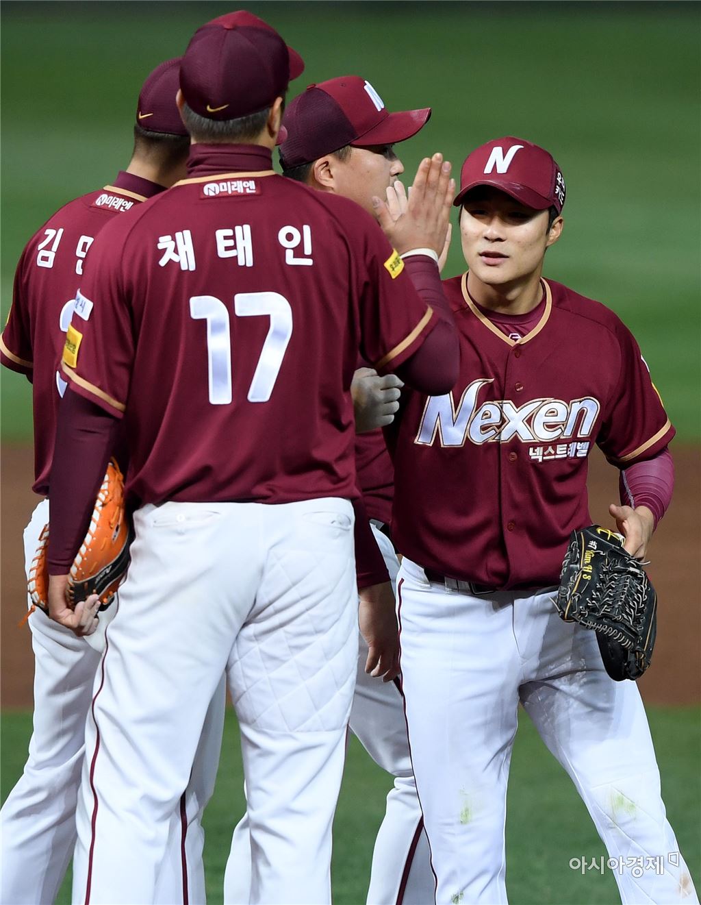 [인천=아시아경제 김현민 기자]프로야구 넥센 히어로즈와 SK와이번스의 2017 KBO리그 경기가 20일 인천 SK행복드림구장에서 열렸다. 넥센 김하성이 팀의 5-3 승리를 확정한 뒤 동료들과 기뻐하고 있다. 김현민 기자 kimhyun81@asiae.co.kr<ⓒ세계를 보는 창 경제를 보는 눈, 아시아경제(www.asiae.co.kr) 무단전재 배포금지>