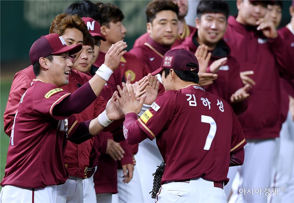 [인천=아시아경제 김현민 기자]프로야구 넥센 히어로즈와 SK와이번스의 2017 KBO리그 경기가 20일 인천 SK행복드림구장에서 열렸다. 넥센 선수들이 5-3 승리를 확정한 뒤 기뻐하고 있다. 김현민 기자 kimhyun81@asiae.co.kr<ⓒ세계를 보는 창 경제를 보는 눈, 아시아경제(www.asiae.co.kr) 무단전재 배포금지>