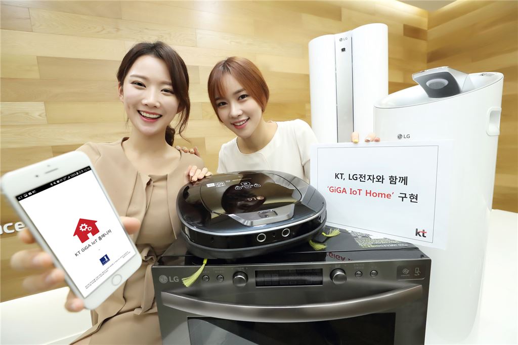 KT는 LG전자와 함께 가전제품과 연동되는 'GiGA IoT 홈매니저' 서비스 6종을 선보이고, '홈 IoT(Internet Of Things)' 확산을 위한 협력을 강화한다고 21일 밝혔다. 이번에 연동되는 6종의 가전제품은 에어컨, 공기청정기, 로봇청소기, 오븐, 냉장고, 세탁기이다. 모델들이 KT가 LG전자와 함께 선보이는 'GiGA IoT 홈매니저' 서비스를 소개하고 있다.