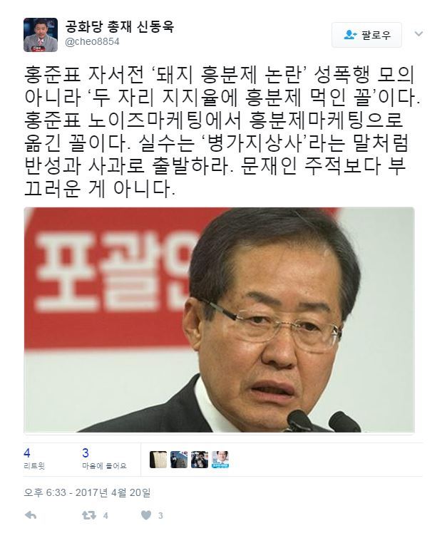 21일 공화당 신동욱 총재가 자유한국당 홍준표 후보의 돼지 발정제 논란에 대해 "성폭행 모의가 아니라 두 자리 지지율에 흥분제 먹인 꼴"이라고 말했다.신 총재는 자신의 트위터에 "홍준표 자서전 '돼지 흥분제 논란' 성폭행 모의가 아니라 '두 자리 지지율에 흥분제 먹인 꼴'이다."면서 "홍준표 노이즈 마케팅에서 흥분제마케팅으로 옮길 꼴이다.”라고 말했다.이어 "병가지상사라는 말처럼 반성과 사과로 출발하라. 문재인 주적보다 부끄러운 게 아니다."라고 말했다.한편, 이날 자유한국당 정준길 대변인은 홍 후보의 '성범죄 모의' 논란에 대해 "당시에도 책에서 이미 잘못된 일이라고 반성했다. 불쾌하셨다면 진심으로 사과드린다."며 "다만 45년 전 사회적 분위기가 다른 상황에서 혈기왕성한 대학교 1학년 때 벌어진 일이라는 점을 너그럽게 고려해달라"고 말했다.<center><div class="slide_frame"><input type="hidden" id="slideIframeId" value="2016081609140181676A">